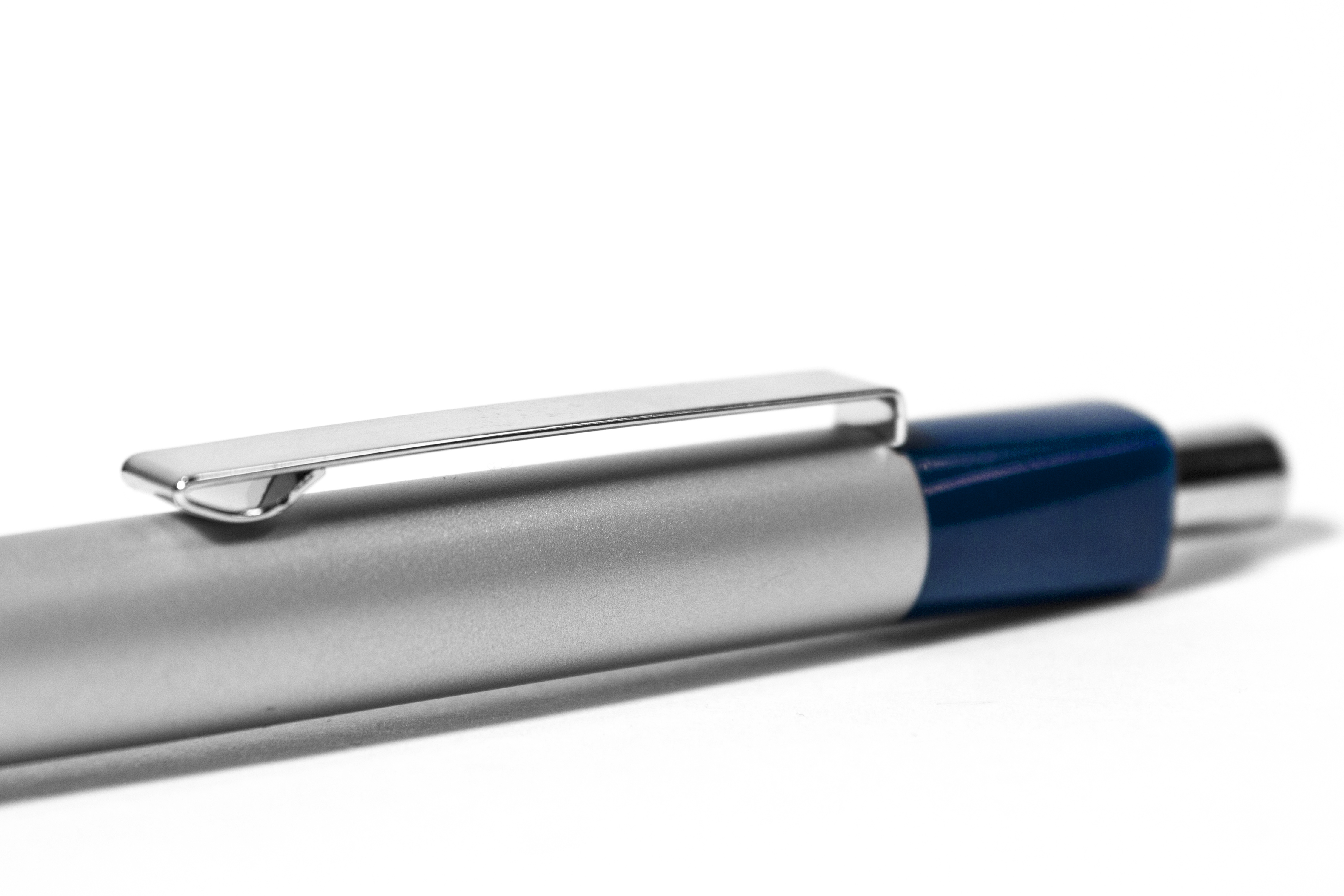 Metálico. Pulsador y puntera plásticos color plata, clip metálico. Cabezal cuadrado plástico de color. Gomas laterales antideslizantes. Tinta negra