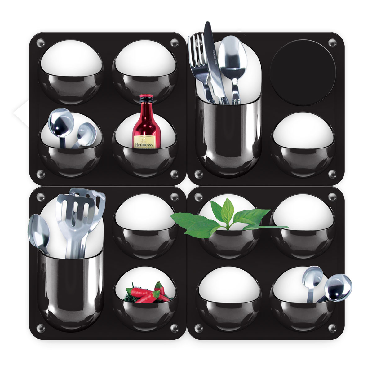 21 x 21 x 5 cm. Plástico. Sistema de contenedores modulares para organizar desde productos de escritorio hasta utensilios de cocina, artículos de baño o herramientas de jardinería. Puede ir apoyado, colgado, pegado o amurado. Incluye 1 ranura posterior para colgado, 2 patas para apoyo, 4 stickers para pegado y 4 tornillos + 4 tarugos para montado en pared. Presentación en caja de regalo.