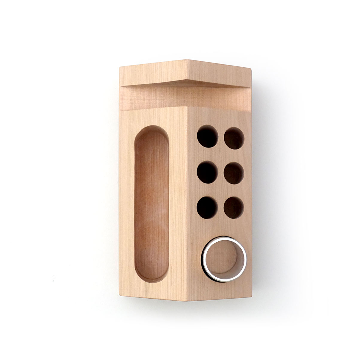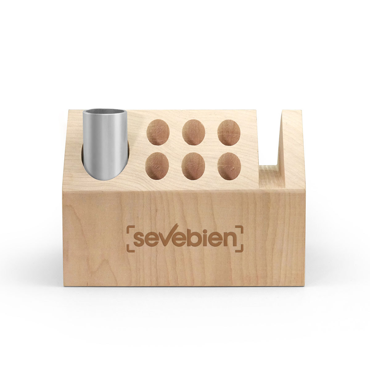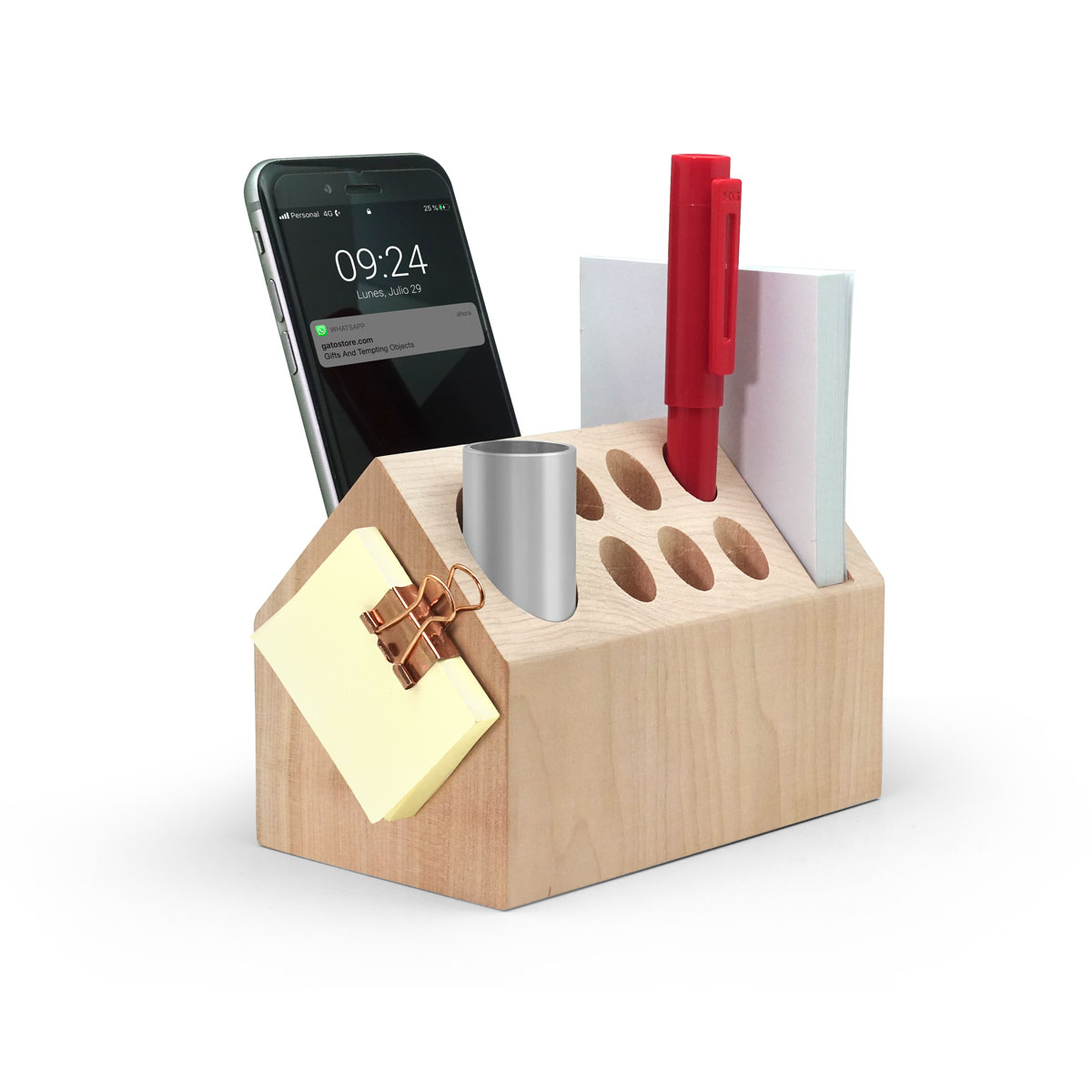 Pieza de madera imantada para combinar. Multiples ranuras multipropósito para usar como lapicero, porta celular, porta tarjetas o para organizar post-its, papeles, banditas elásticas, clips, ganchos y otros objetos de escritorio. Presentación en caja de regalo.