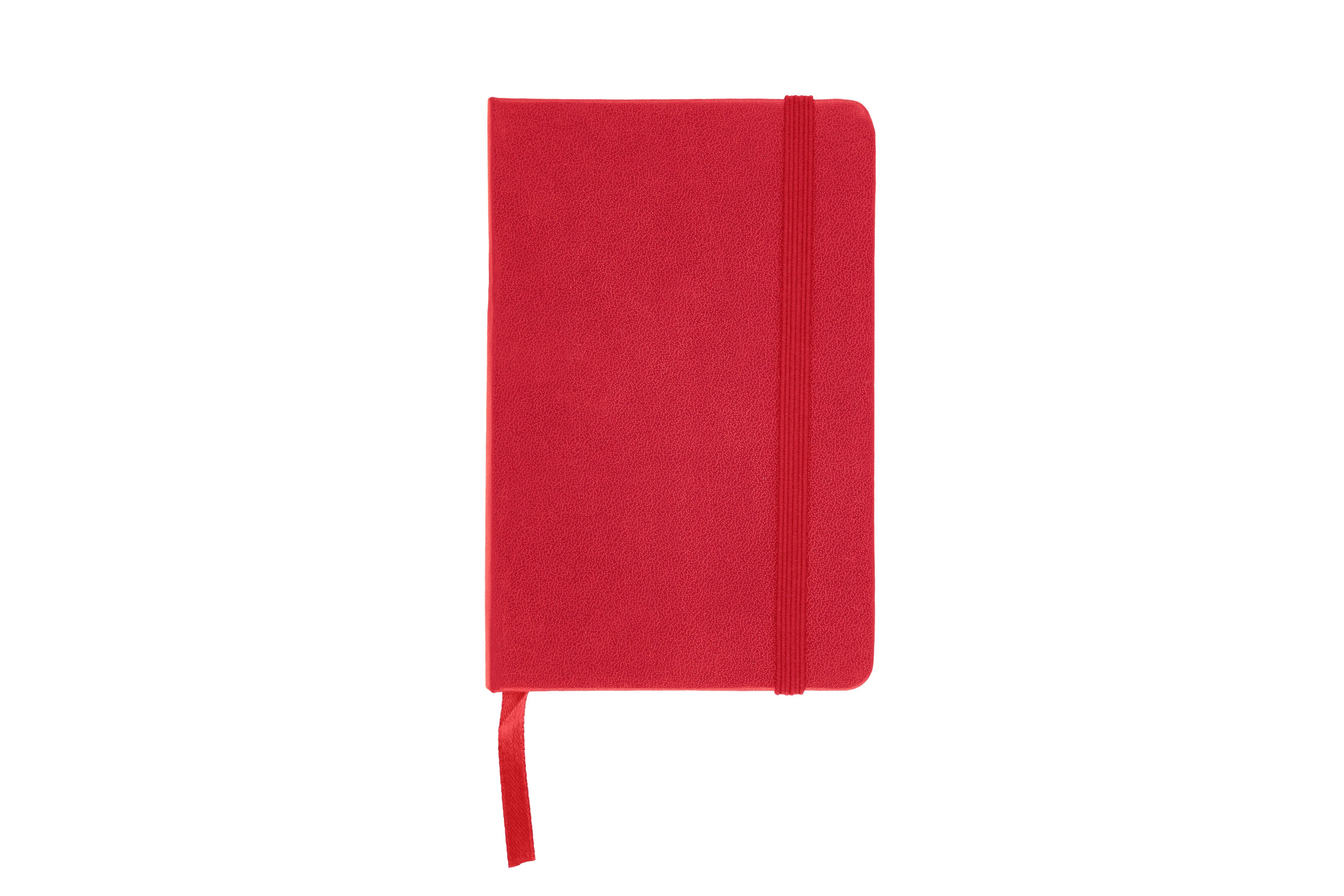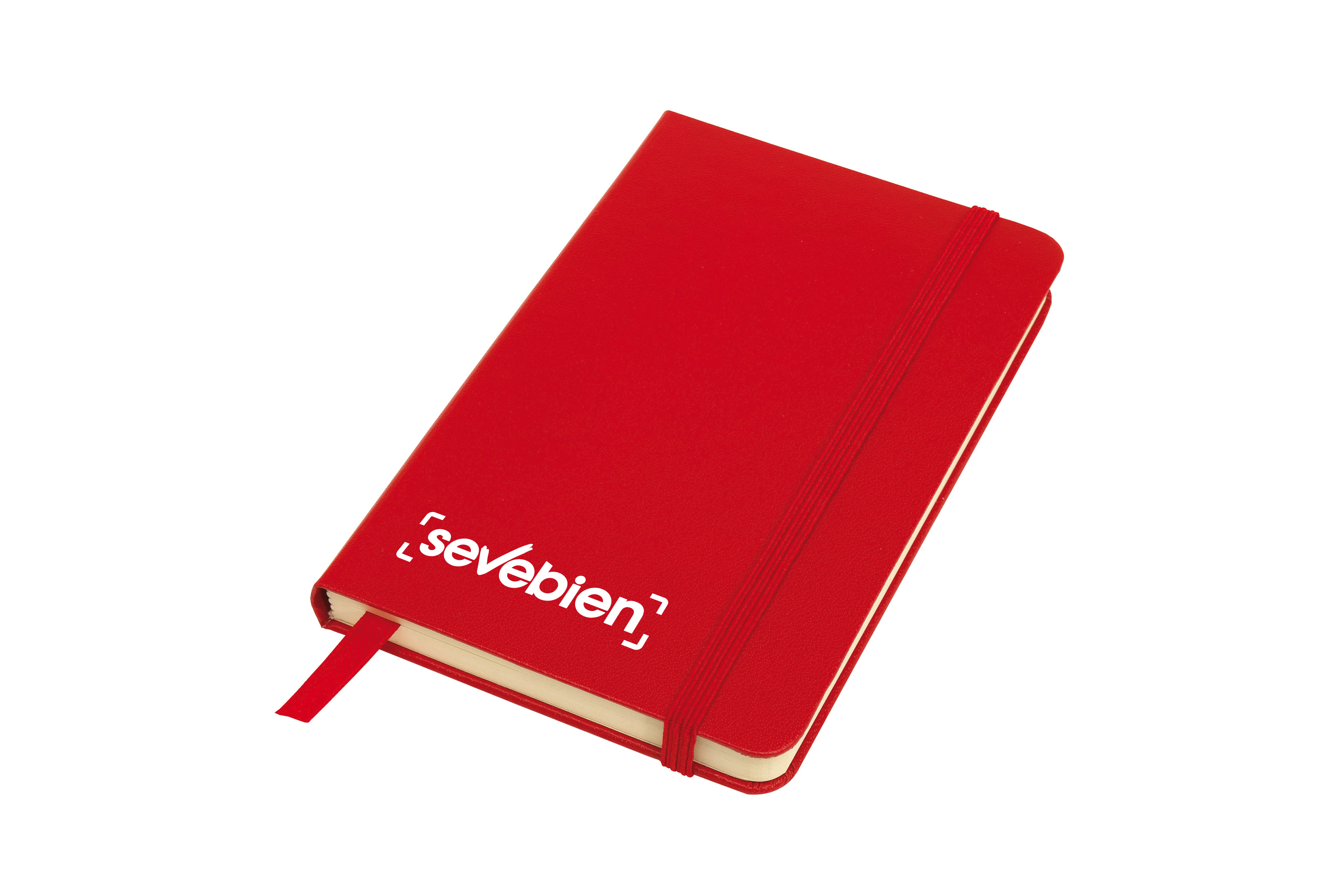 Cartón. 14 x 9 x 1,5 cm. Contiene 80 hojas rayadas y separador en tela. Posee cierre con banda elástica. Amplia área de impresión.