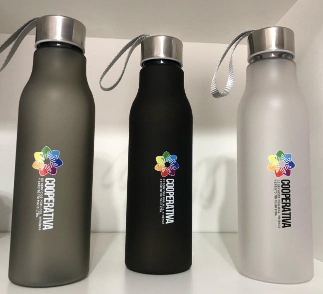 Botella tipo caramañola esmerilada plástica con tapón a rosca de acero.
