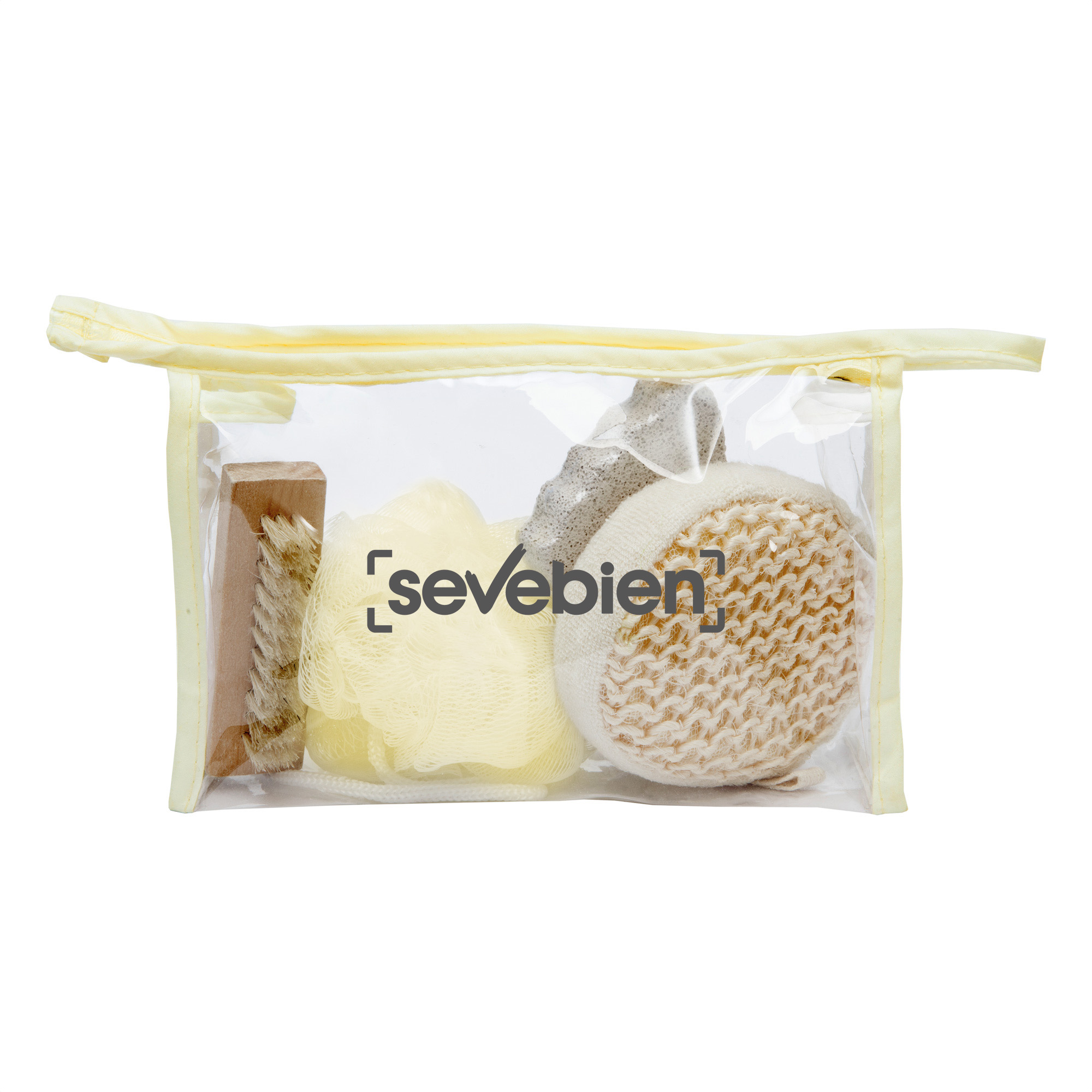 18,5 x 12 x 5 cm. Plástico. Set con 2 esponjas una es exfoliante, piedra/lima y cepillo de uñas.