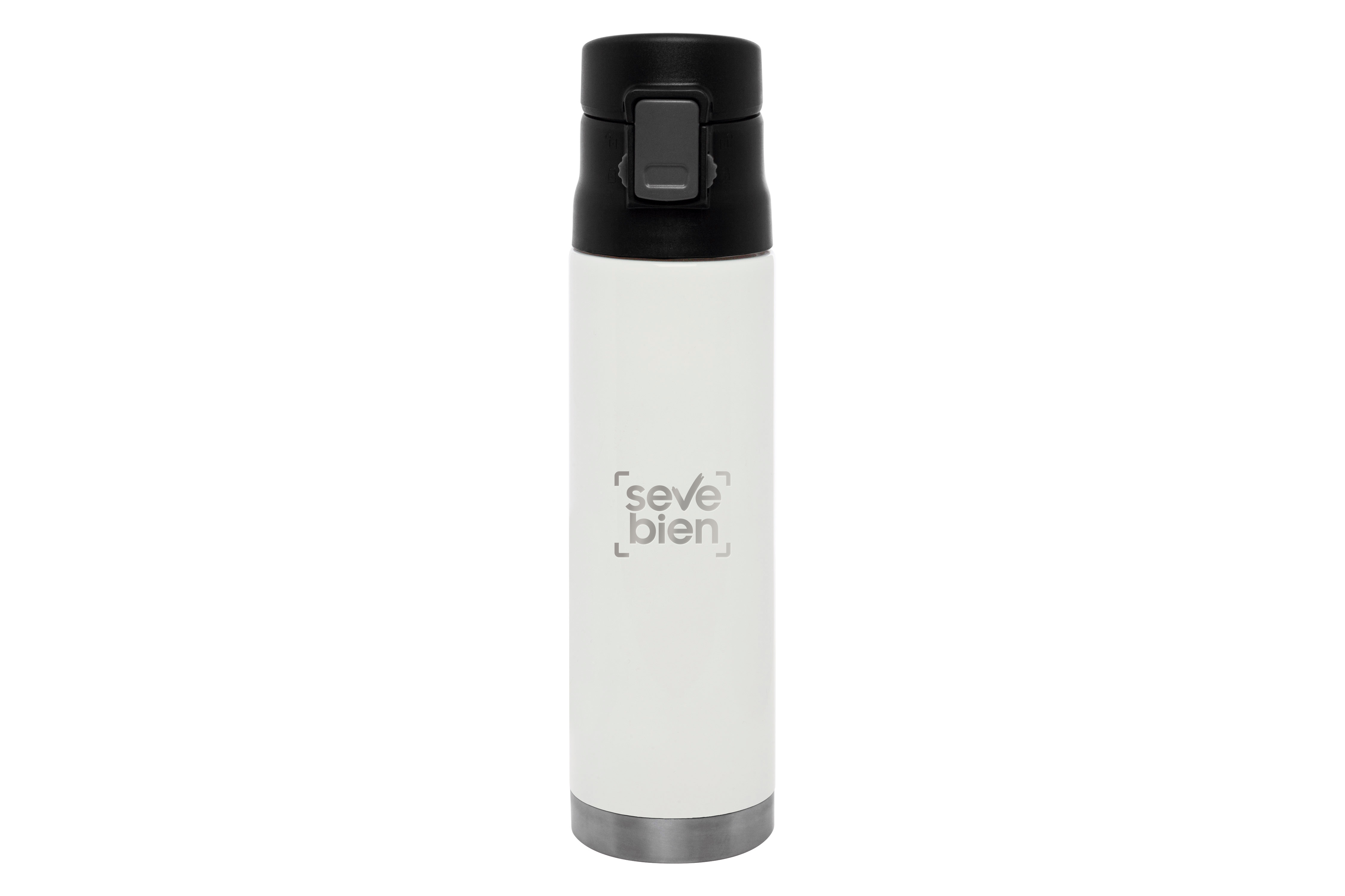 Ø 7 x 25,5 cm. Capacidad 500 ml. Acero inoxidable. Mug doble pared, sin tratamiento de vacío. Interior de acero 304 y exterior de acero 201. Tapa plástica con botón a presión de apertura. Traba de seguridad. Mantiene las bebidas frías y calientes por más tiempo. Presentación en caja de regalo.