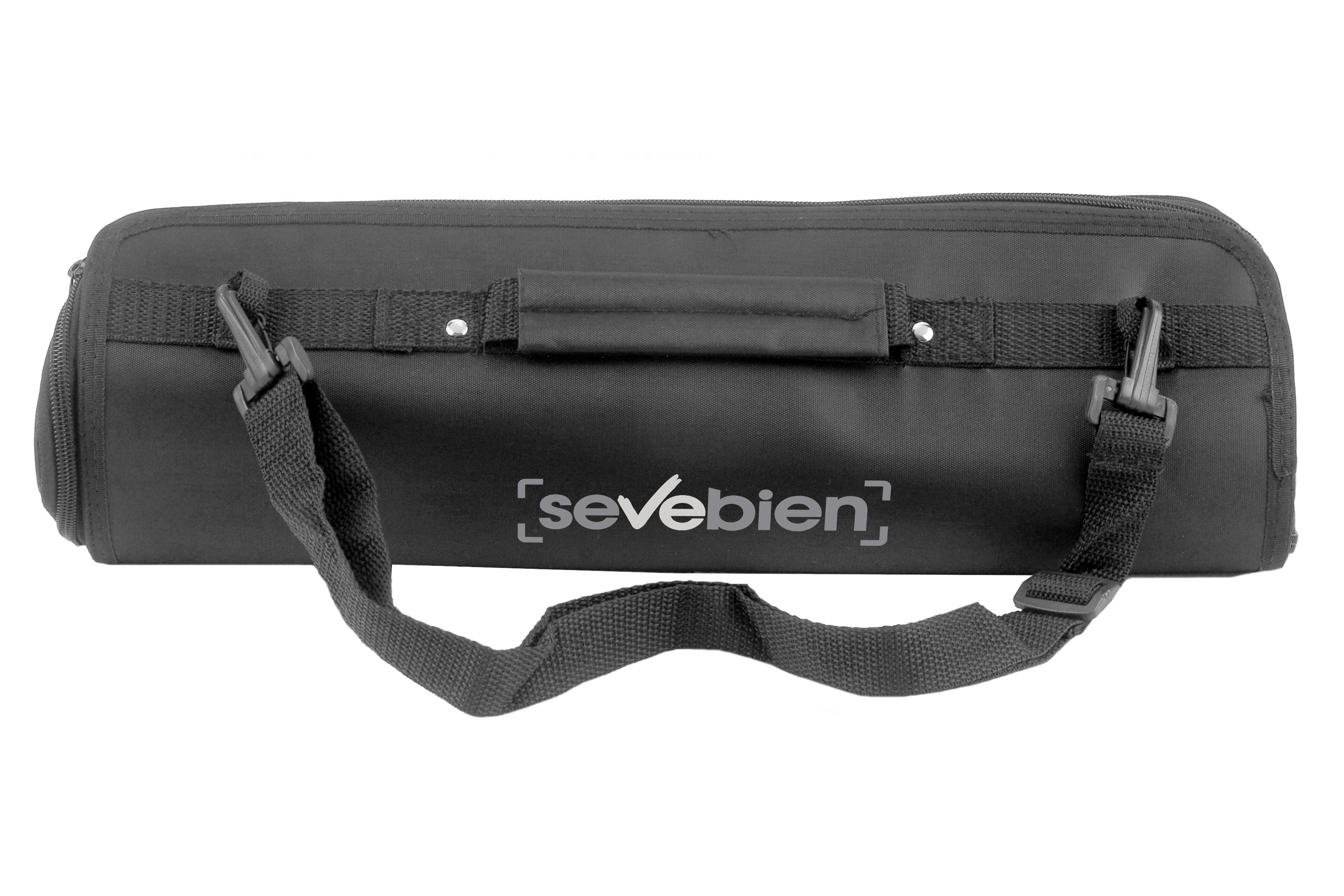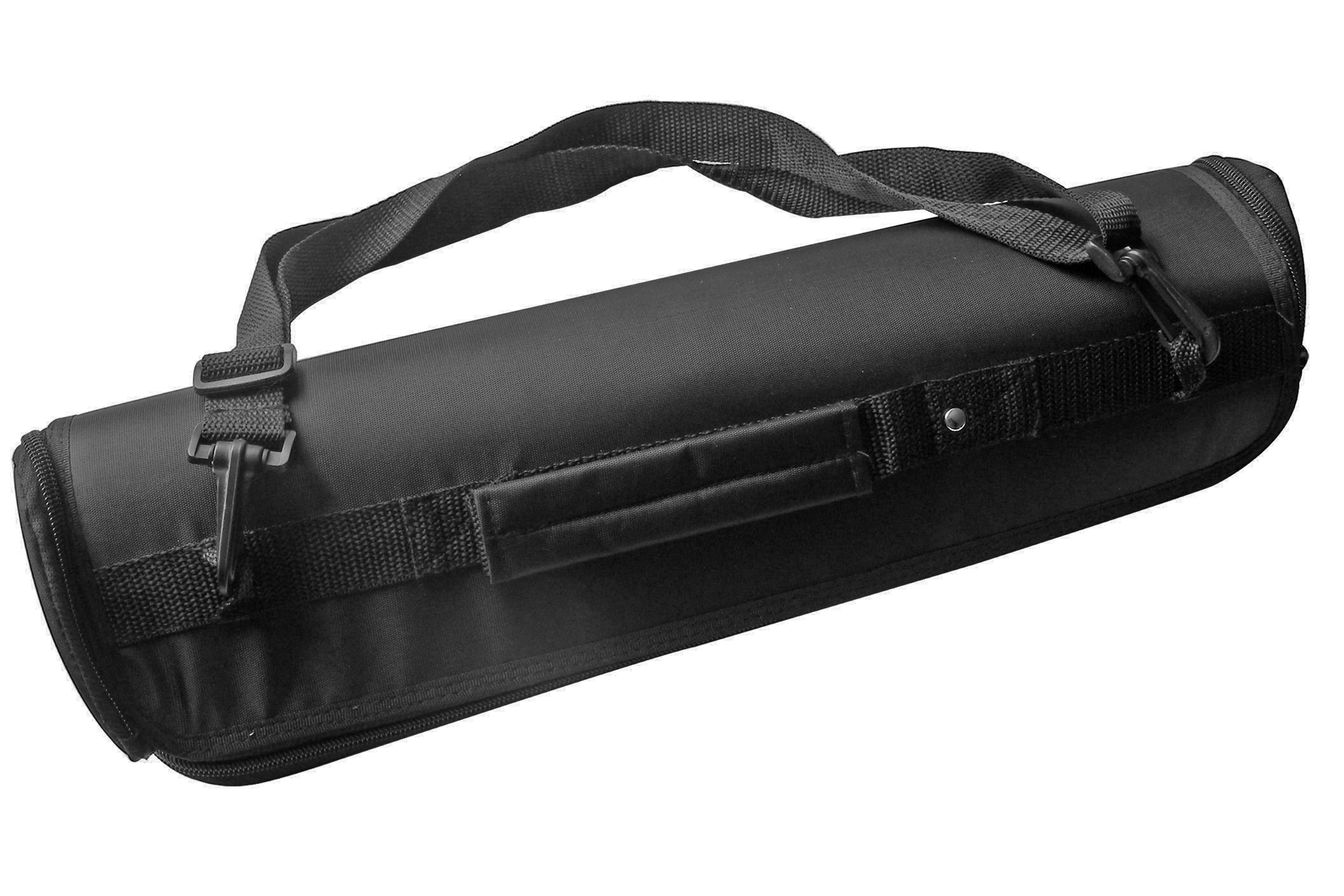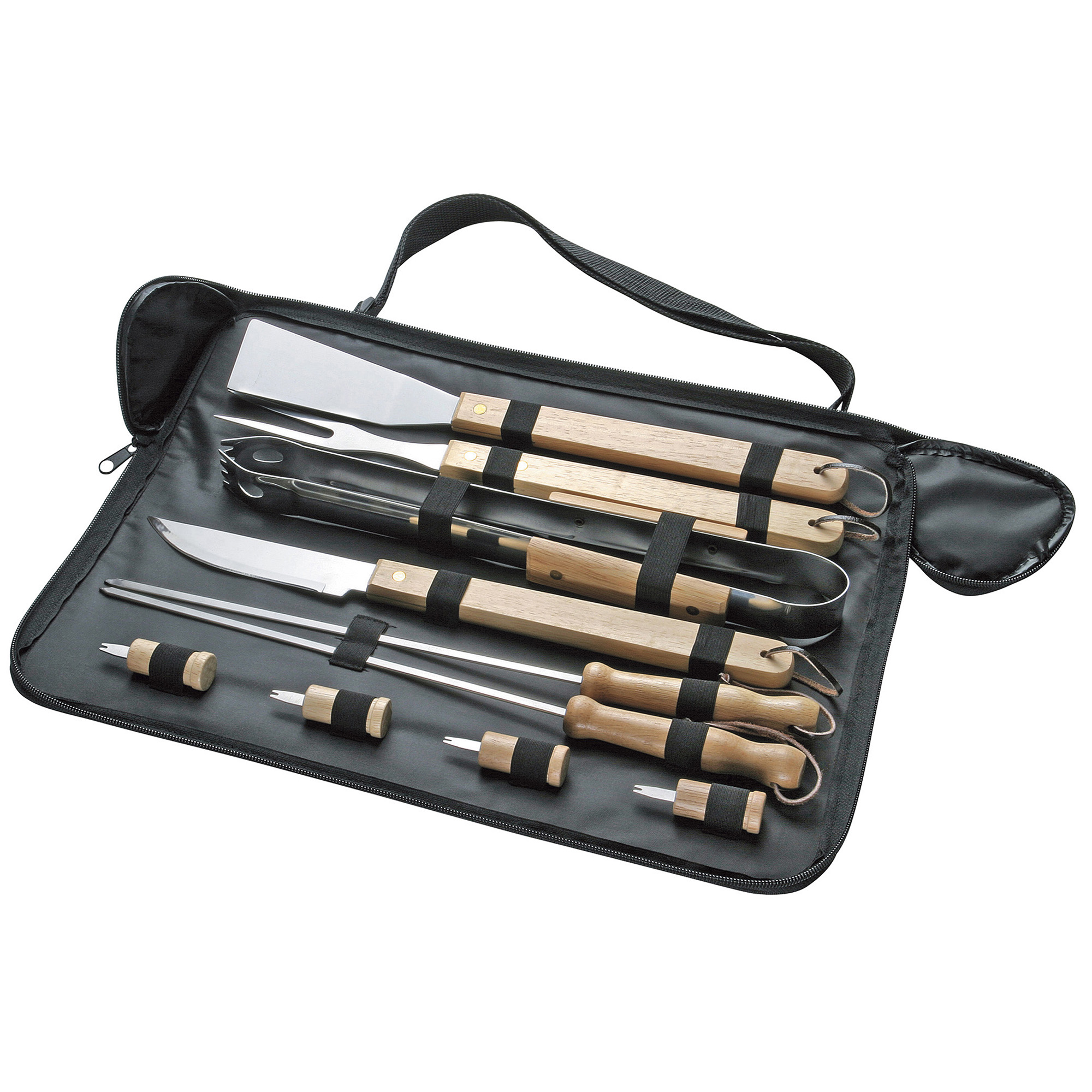 Ø 11,5 x 42,5 cm. Acero inoxidable y madera + Poliéster 210D. Set de 10 piezas: Espátula, tenedor parrillero con mango, pinza, cuchilla, 2 pinchos para brocheta y 4 pinchos pequeños. Estuche con cierre y correa regulable.